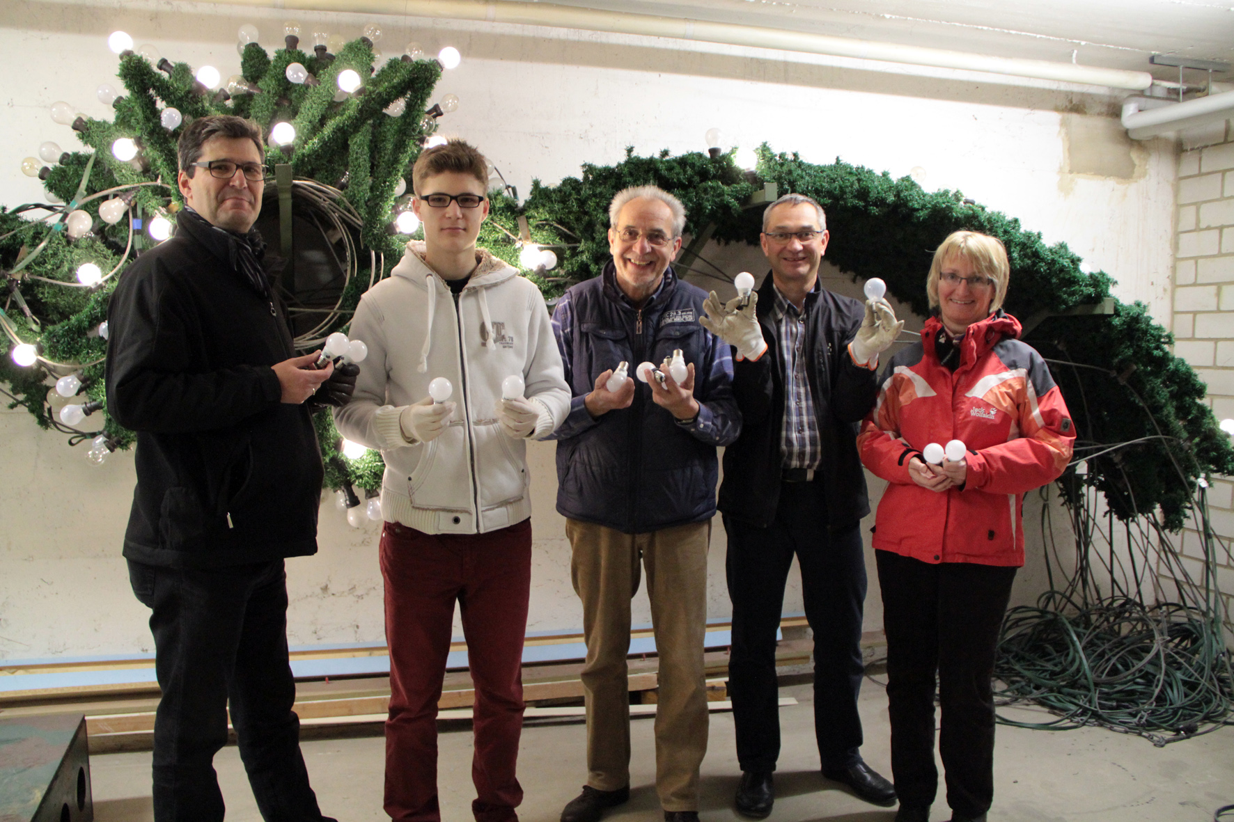 Manfred Knie, Luis Knie, Willi Schibilla, Stephan Kohl und Gabi Kohl (v.l.) schraubten 1150 neue LED-Lampen in die Kaller Weihnachtsbeleuchtung. Bild: Michael Thalken/Eifeler Presse Agentur/epa